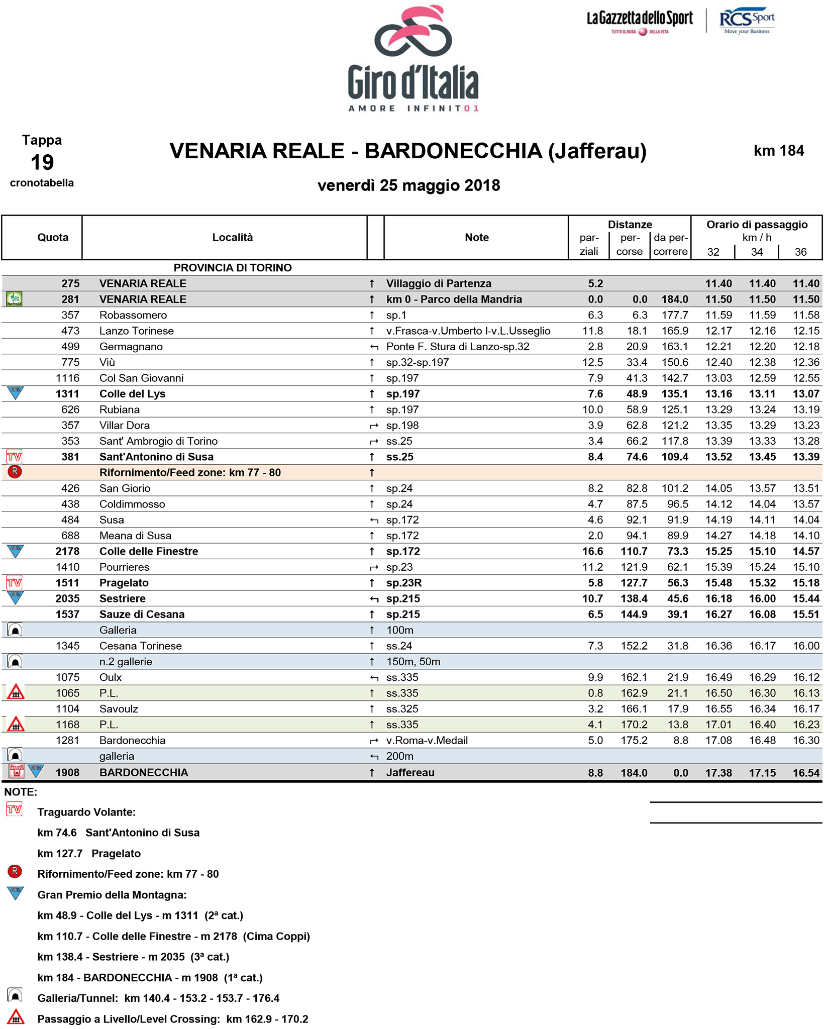 Dopo aver ospitato quattro anni fa la partenza del Giro d'Italia, la CesanaTorinese - Col du Galibier la Corsa Rosa torna, venerdì 25 maggio, ad attraversare le montagne olimpiche piemontesi in occasione della 19 tappa. I ciclisti partiranno da Venaria Reale, scaleranno il Colle del Lys da Viù per discendere nella valle della Dora Riparia e portarsi a Meana di Susa per la scalata del Colle delle Finestre, Cima Coppi del 101° Giro d'Italia. Poi Usseaux, Pragelato, Sestriere, Sauze di Cesana, Cesana Torinese, Oulx, Bardonacchia, ed il traguardo sullo Jafferau.