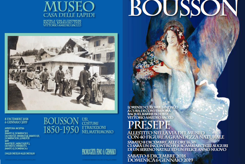 Sempre a Bousson, dall’8 dicembre al 6 gennaio 2019 presso il Museo Casa delle Lapidi, è possibile visitare la mostra “Bousson 1850-1950 Usi, costumi e tradizioni nel matrimonio”. Giorni ed orari apertura mostra (ingresso libero): 8-9-27-28-29-30-31 dicembre e dall’1 al 6 gennaio 2019 dalle ore 15.00 alle 18.00.