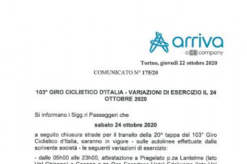 Come da avviso inoltrato dalla società, seguito chiusura strade per il transito della 20° tappa del Giro d’Italia, sono state indette variazioni sulle corse e fermata BUS per la giornata di Sabato...
