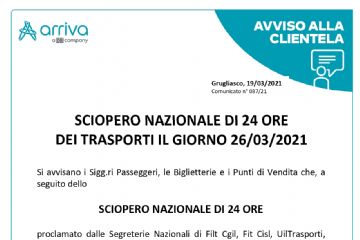 Si avvisa la clientela Arriva che nella giornata di Venerdì 26/03/2021 seguito sciopero nazionale di 24 ore, potranno verificarsi limitazioni e/o...