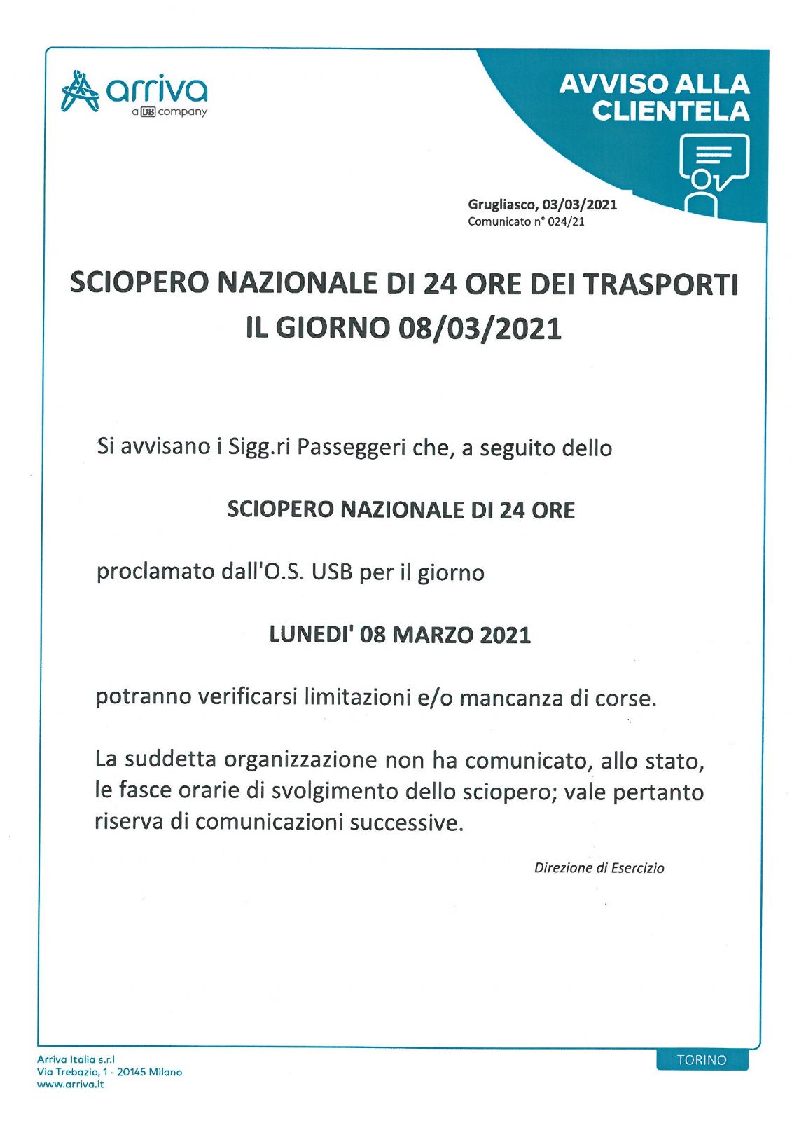Si avvisa la clientela Arriva che nella giornata di lunedì 08/03/2021 seguito sciopero nazionale di 24 ore, potranno verificarsi limitazioni e/o mancanze di corse.