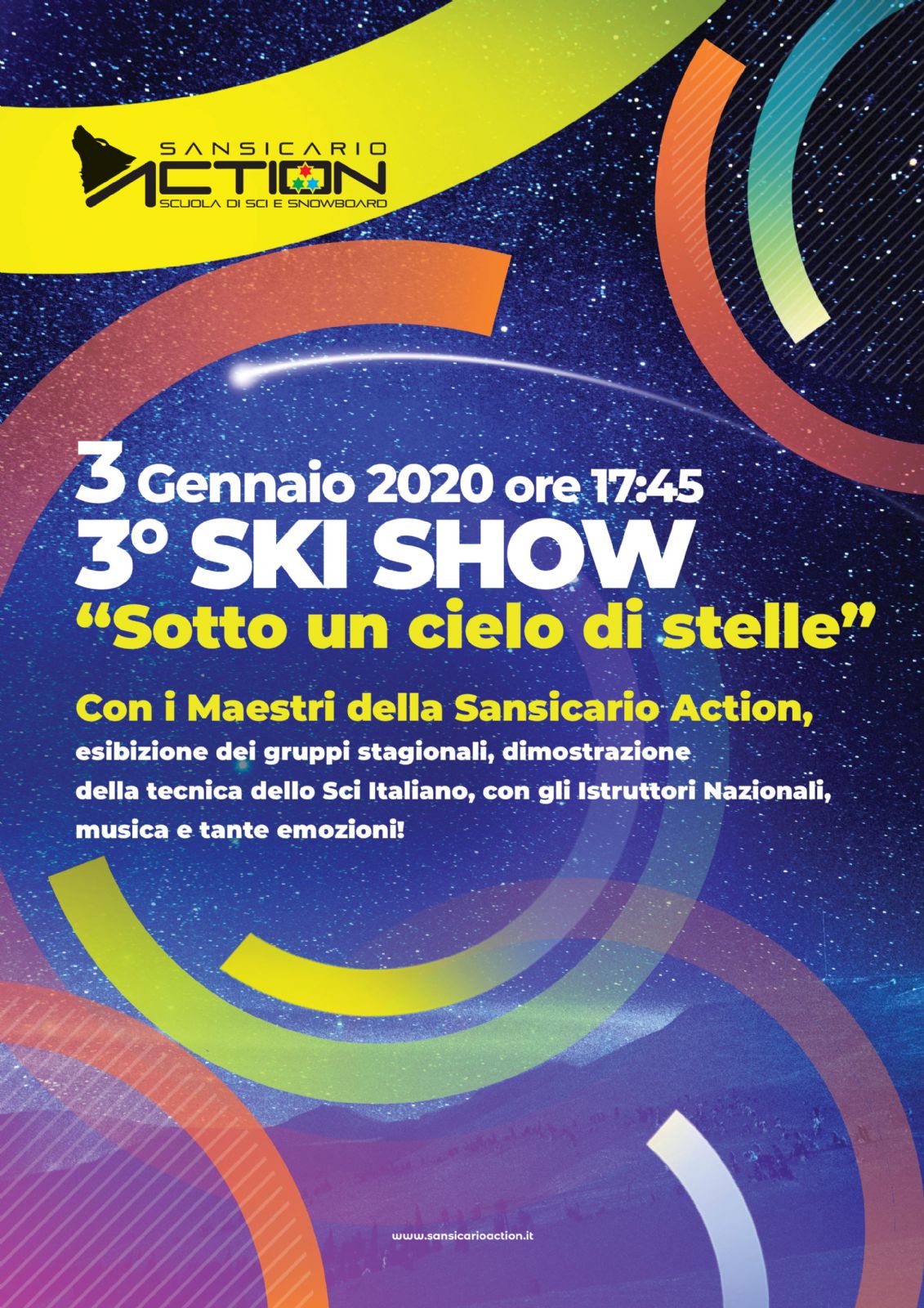 Esibizione dei maestri e dei gruppi della Scuola Sci Sansicario Action, dimostrazioni della tecnica dello sci italiano con gli Istruttori Nazionali, musica e tante emozioni!