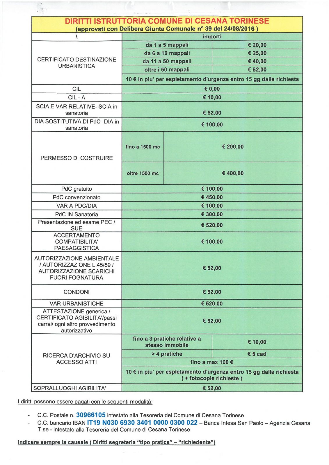 Con la presente si comunica che con D.G.C. n° 39 del 24/08/2016 sono stati aggiornati i diritti di segretria per l' Area Tecnica - Edilizia Privata e Urbanistica.