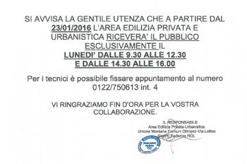Si comunica alla gentile utenza che a partire da lunedì 23/01/2017 l' Area edilizia Privata e Urbanistica seguirà il seguente orario di apertura al pubblico: 9.30-12.30 e 14.30-16.00.
