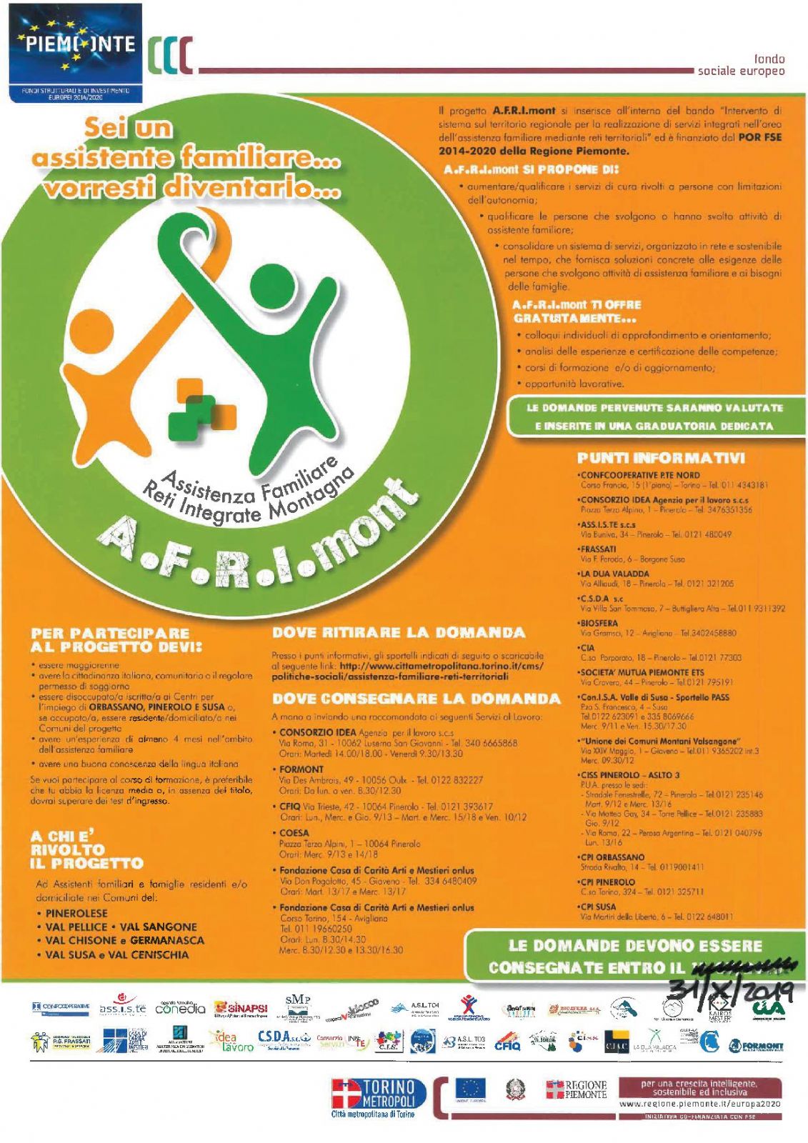 Il progetto A.F.R.I.mont si inserisce all'interno del bando "Intervento di sistema sul territorio regionale per la realizzazione di servizi integrati nell'area dell'assistenza familiare mediante reti territoriali" ed è finanziata dal POR FSE 2014-2020 della Regione Piemonte.