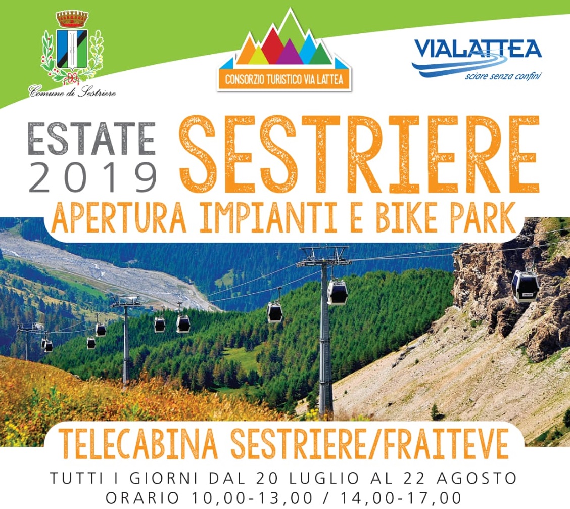 La Telecabina Sestriere-Fraiteve, in virtù dell’accordo tra il Comune di Sestriere e la Vialattea, sarà in funzione tutti i giorni dal 20 luglio al 22 agosto 2019 con orario dalle 10.00 alle 13.00 e dalle 14.00 alle 17.00.