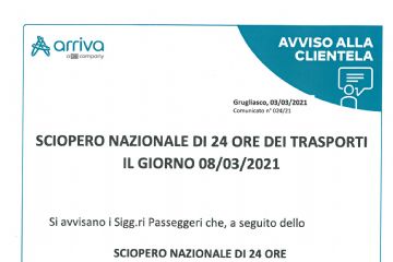 Si avvisa la clientela Arriva che nella giornata di lunedì 08/03/2021 seguito sciopero nazionale di 24 ore, potranno verificarsi limitazioni e/o...