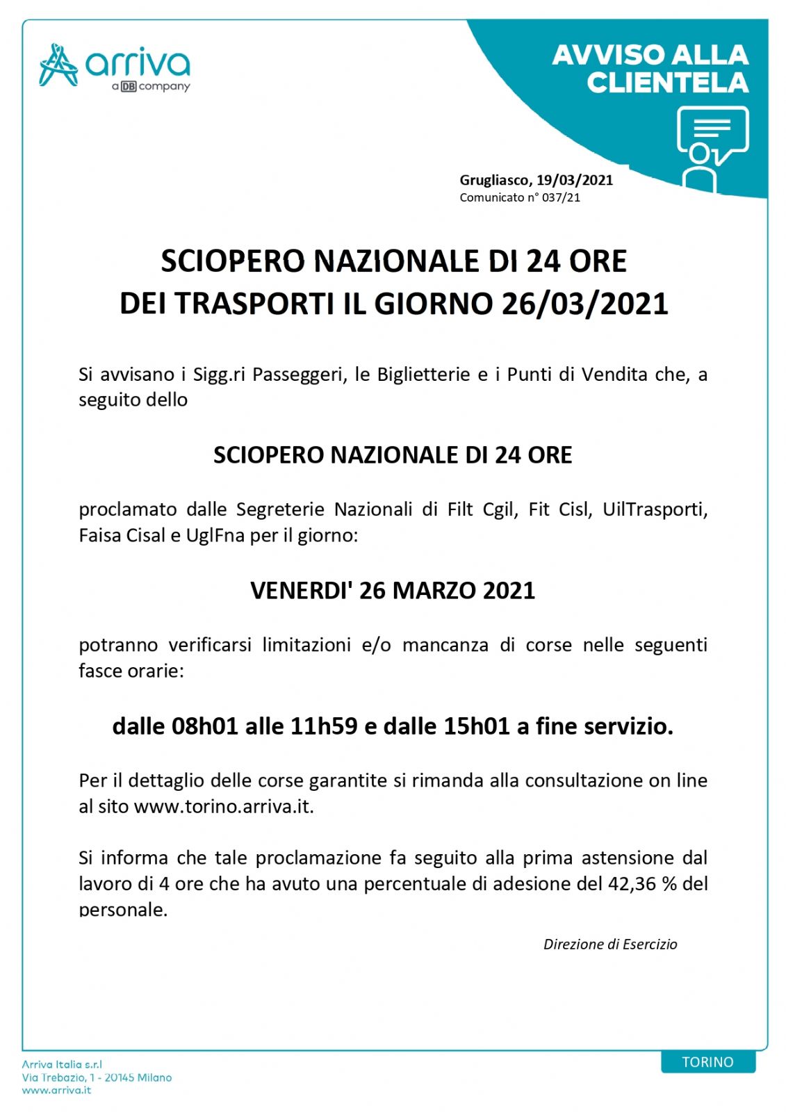 Si avvisa la clientela Arriva che nella giornata di Venerdì 26/03/2021 seguito sciopero nazionale di 24 ore, potranno verificarsi limitazioni e/o mancanze di corse.